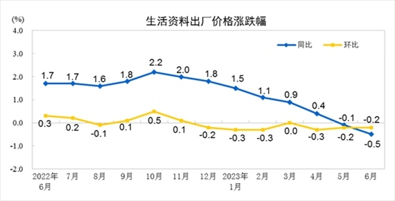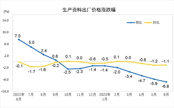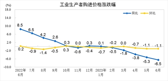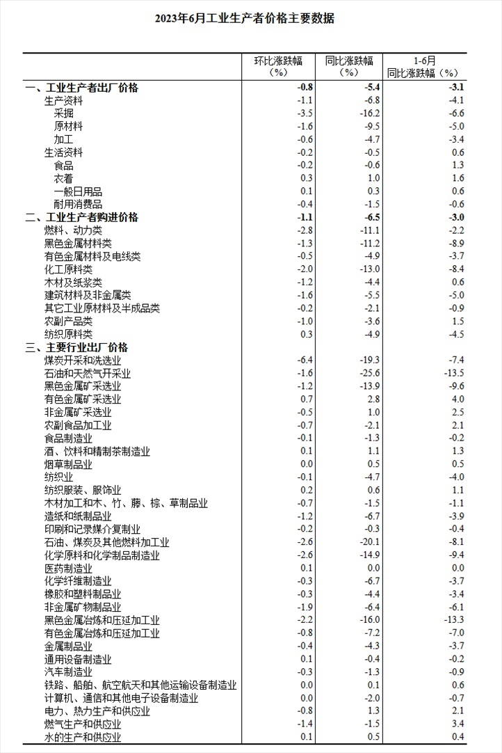 央視網(wǎng)消息:據(jù)國家統(tǒng)計(jì)局網(wǎng)站消息,2023年6月份,全國工業(yè)生產(chǎn)者出廠價(jià)格同比下降5.4%,環(huán)比下降0.8%;工業(yè)生產(chǎn)者購進(jìn)價(jià)格同比下降6.5%,環(huán)比下降1.1%。上半年,工業(yè)生產(chǎn)者出廠價(jià)格比上年同期下降3.1%,工業(yè)生產(chǎn)者購進(jìn)價(jià)格下降3.0%。