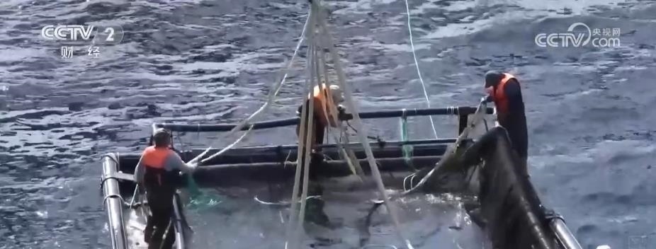 在煙臺(tái)長(zhǎng)島南隍城海域,隨著經(jīng)海系列深水網(wǎng)箱里魚(yú)類的成熟,一場(chǎng)在大海上的收獲正在進(jìn)行。起降機(jī)將一個(gè)個(gè)裝滿魚(yú)兒的巨大網(wǎng)兜轉(zhuǎn)移到運(yùn)輸船上,2.5萬(wàn)尾近4萬(wàn)斤的成品黑鲪魚(yú),將從這里銷往全國(guó)各地。