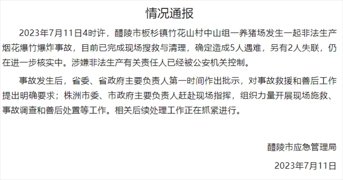·11日,湖南醴陵發(fā)生一起非法生產煙花爆竹爆炸事故,造成5人遇難,2人失聯(lián),涉嫌非法生產有關責任人已被公安機關控制,案件仍在進一步核實中。