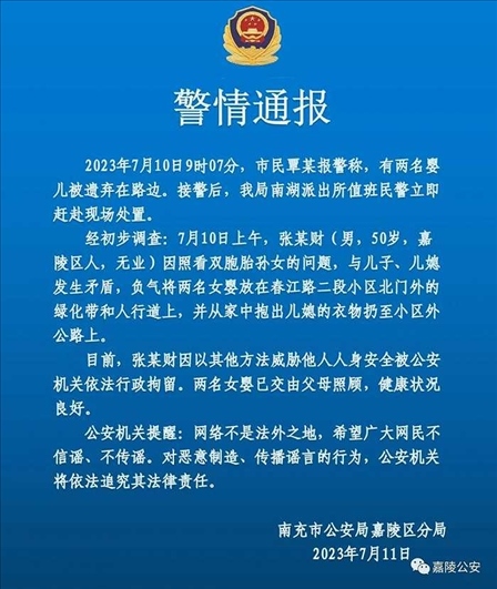 ·網傳“老人當街遺棄雙胞胎女嬰”,警方:系負氣而為,已行拘。