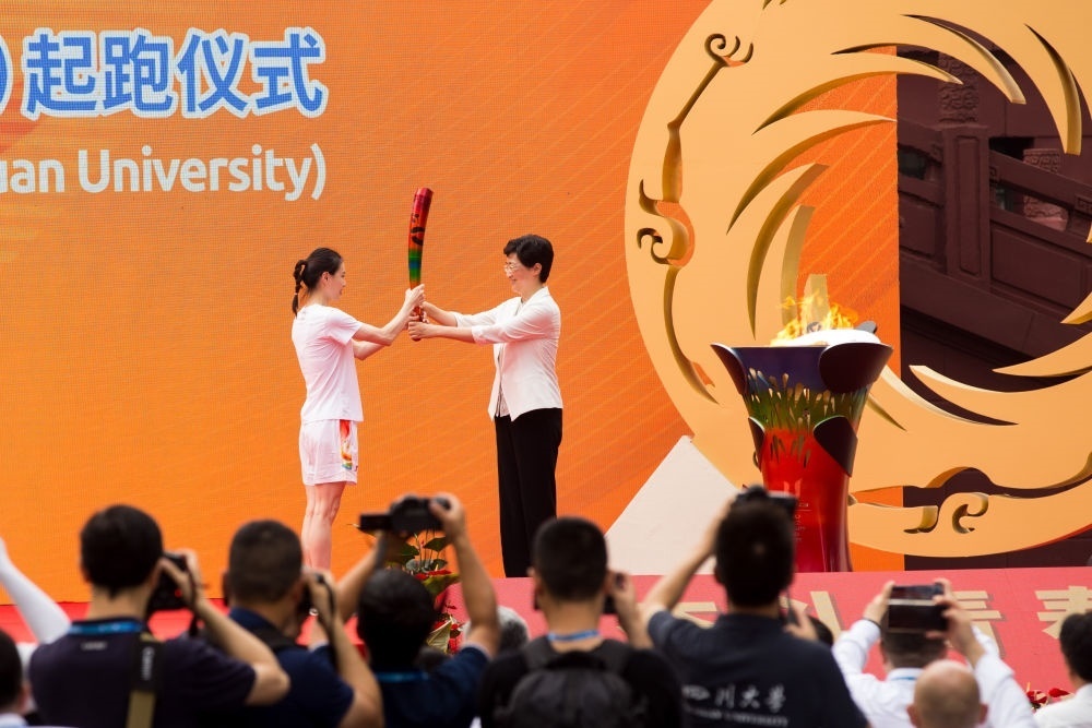 7月2日,第一棒火炬手吳敏霞(左)接過點(diǎn)燃的火炬。當(dāng)日,成都第31屆世界大學(xué)生夏季運(yùn)動(dòng)會(huì)火炬?zhèn)鬟f成都站起跑儀式在四川大學(xué)校園內(nèi)舉行。新華社發(fā)(曹鵬攝)