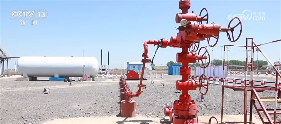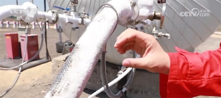 總臺記者 閆崎峰:可以看到我旁邊的這些管線上凝結(jié)了厚厚的白霜,管子里運(yùn)輸?shù)木褪堑蜏匾簯B(tài)下的二氧化碳。這些二氧化碳被這些高壓泵送入距離我腳下4000多米的原油層中。加入了二氧化碳的原油會(huì)變得蓬松、流動(dòng)性好,便于采集,這種方式可以提高至少18%的采收率。