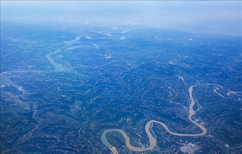 成都,兩條河流一條呈黃色,一條現(xiàn)藍(lán)色,涇渭分明、蜿蜒曲折,似一青一黃兩條巨龍橫臥大地。
