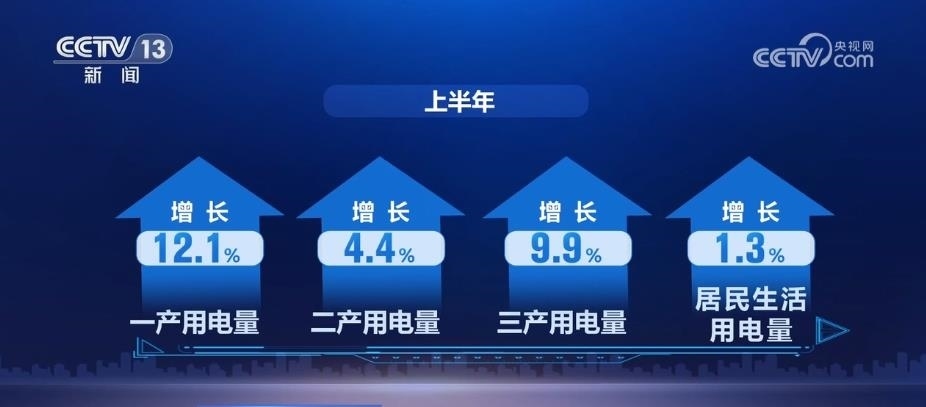 從用電情況看,上半年,全國全社會用電量同比增長5.0%。其中,一產(chǎn)、二產(chǎn)、三產(chǎn)和居民生活用電量分別增長12.1%、4.4%、9.9%和1.3%。