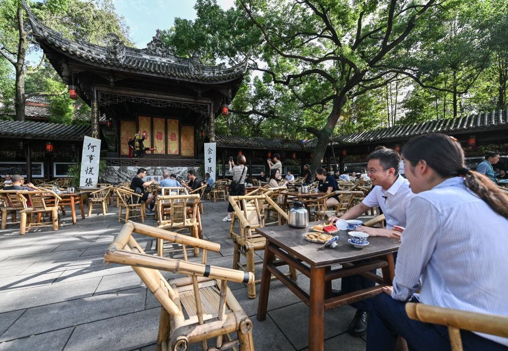 7月14日,在成都高新區(qū)鐵像寺水街,游客在茶鋪體驗當?shù)靥厣w碗茶。新華社記者 王曦 攝