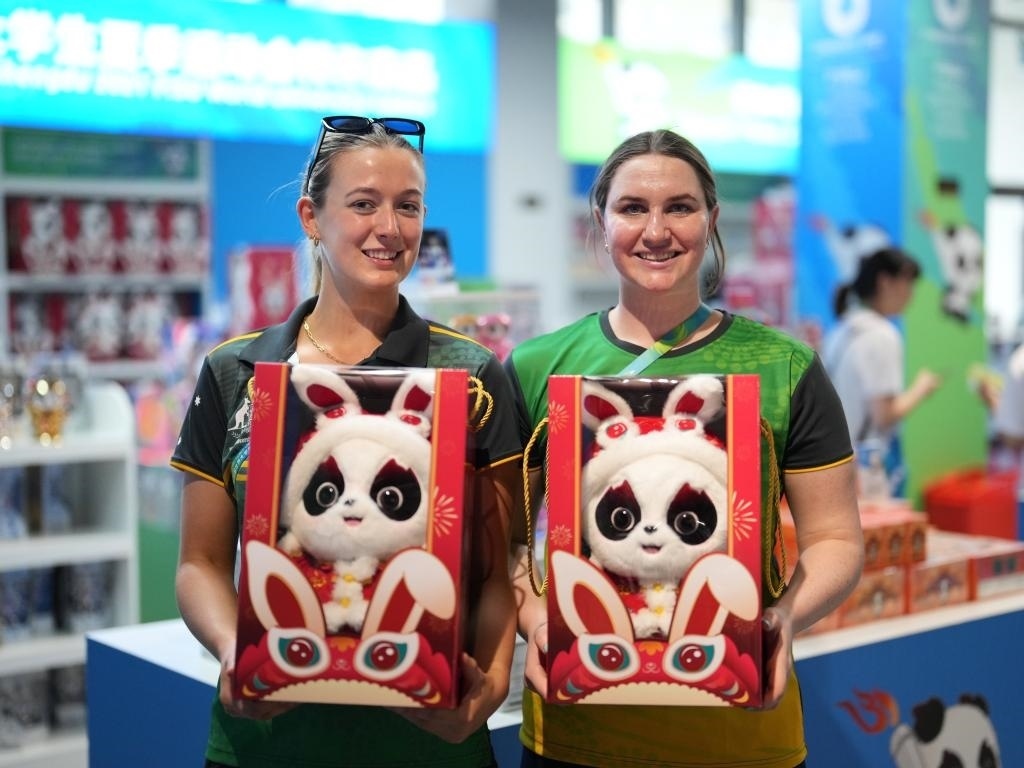 蘇珊(左)和隊(duì)友展示剛剛買到的兔年版“蓉寶”。新華社記者 鄭直 攝