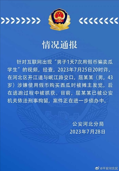 ·男子1天7次用假幣騙賣(mài)瓜學(xué)生?天津警方通報(bào)。