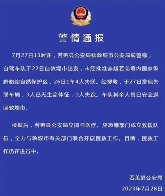 ·新疆若羌縣警方通報(bào)一車(chē)隊(duì)未經(jīng)批準(zhǔn)穿越自然保護(hù)區(qū):3人無(wú)生命體征,1人失蹤。
