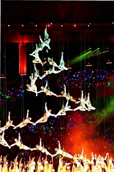 成都大運(yùn)會開幕式現(xiàn)場的文藝演出。本報記者 郭俊鋒攝/光明圖片