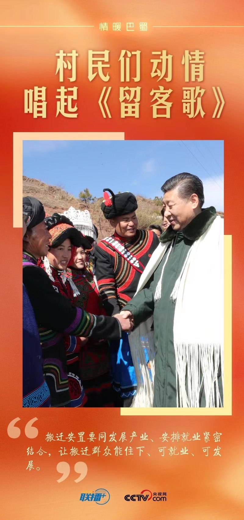 總書記離開村子時(shí),身著彝族盛裝的鄉(xiāng)親們排起長隊(duì)。村黨支部書記代表全村人向總書記獻(xiàn)上彝族傳統(tǒng)服飾查爾瓦,表達(dá)對(duì)總書記的愛戴之情。人群中有人唱起彝族民歌《留客歌》,鄉(xiāng)親們都跟著唱起來……掌聲、歌聲、歡呼聲在村子里久久回蕩。