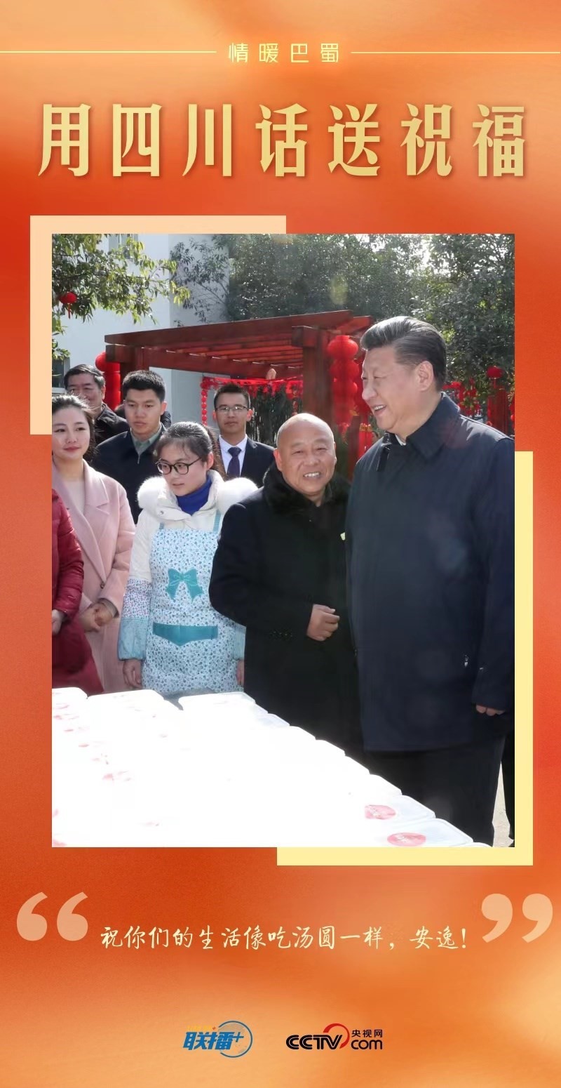 看到有村民在路邊包湯圓,總書記饒有興致地過去觀看,豎起拇指,用四川話對(duì)大家說:“祝你們的生活像吃湯圓一樣,安逸!”