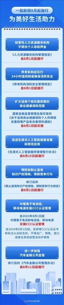 ·一批民生新規(guī)8月開始施行。從完善人力資源服務機構管理,到強化養(yǎng)老機構消防安全;從擴大適用個稅優(yōu)惠政策的商業(yè)健康保險范圍,到規(guī)范生成式人工智能服務……法治,為美好生活助力。