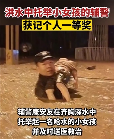 近日,四川瀘州古藺遭遇暴雨洪災多人被困。輔警康安友在齊胸深水中托舉起一名嗆水的小女孩,并及時送醫(yī)救治。7月29日,康安友獲記個人一等獎。
