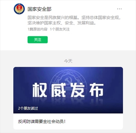 ·國家安全部官微亮相,發(fā)布首條推文《反間防諜需要全社會(huì)動(dòng)員!》。