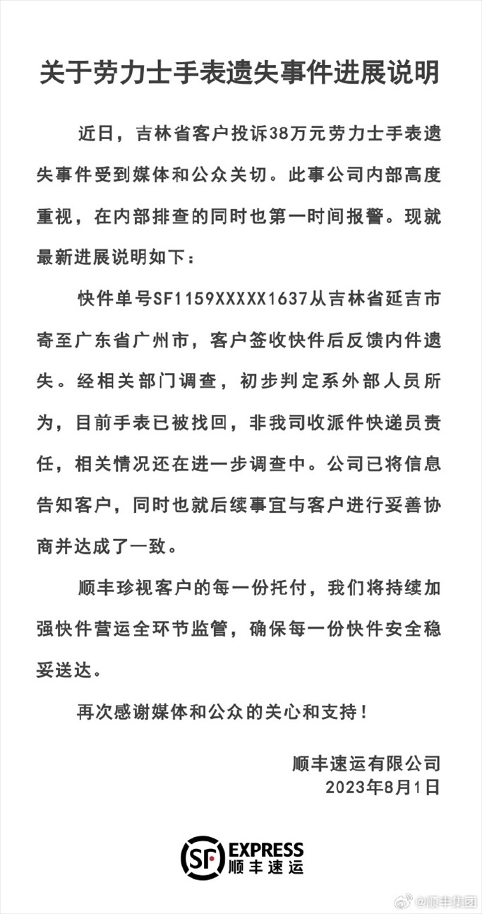 ·順豐速運(yùn)回應(yīng)38萬勞力士手表遺失事件:初判系外部人員所為。
