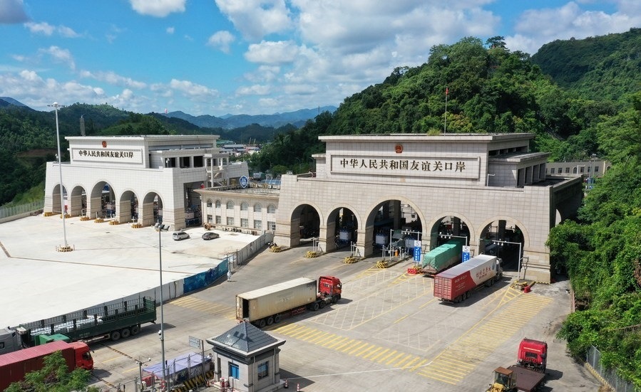 這是在廣西憑祥友誼關(guān)口岸通關(guān)的運(yùn)輸車輛(無人機(jī)照片)。新華社記者 楊馳 攝