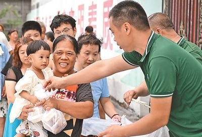 8月6日,河北省涿州市碼頭鎮(zhèn)向五村,天津市阿米瑪瑪何莊子農(nóng)產(chǎn)品批發(fā)市場工作人員為受災群眾免費提供盒飯。本報記者 雷 聲攝