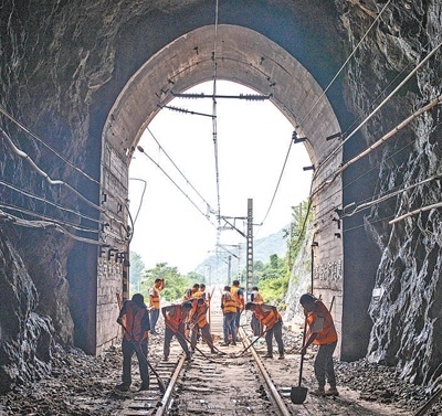 8月7日,北京市門頭溝區(qū)王平鎮(zhèn),中國鐵路北京局北京西工務(wù)段工作人員在清理路基和軌道。本報記者 張武軍攝