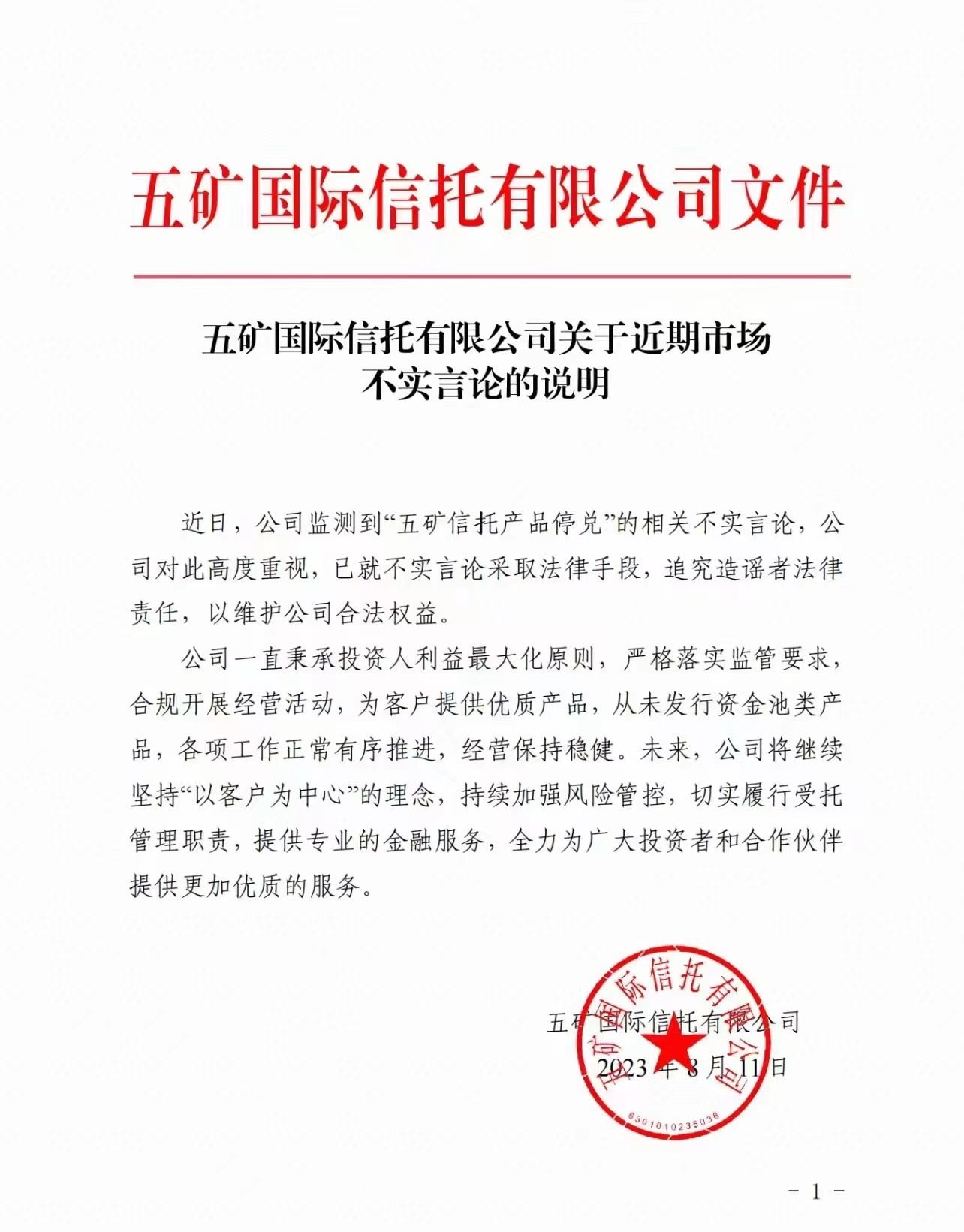 五礦國(guó)際信托有限公司(下稱(chēng)“五礦信托”)發(fā)布聲明稱(chēng),近日,公司監(jiān)測(cè)到“五礦信托產(chǎn)品停兌”的相關(guān)不實(shí)言論,公司對(duì)此高度重視,已就不實(shí)言論采取法律手段,追究造謠者法律責(zé)任,以維護(hù)公司合法權(quán)益。公司一直秉承投資人利益最大化原則,嚴(yán)格落實(shí)監(jiān)管要求,合規(guī)開(kāi)展經(jīng)營(yíng)活動(dòng),為客戶(hù)提供優(yōu)質(zhì)產(chǎn)品,從未發(fā)行資金池類(lèi)產(chǎn)品,各項(xiàng)工作正常有序推進(jìn),經(jīng)營(yíng)保持穩(wěn)健。