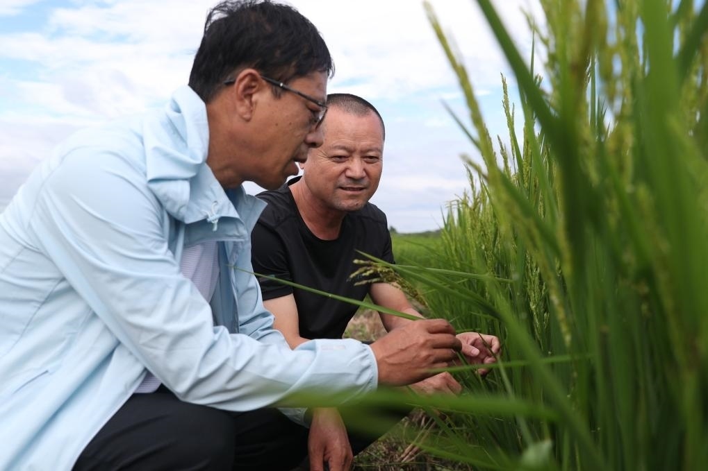 8月11日,黑龍江省尚志市農(nóng)業(yè)技術推廣中心的工作人員在當?shù)匾惶幈缓樗葸^的水稻田里查看水稻情況。新華社記者張濤 攝