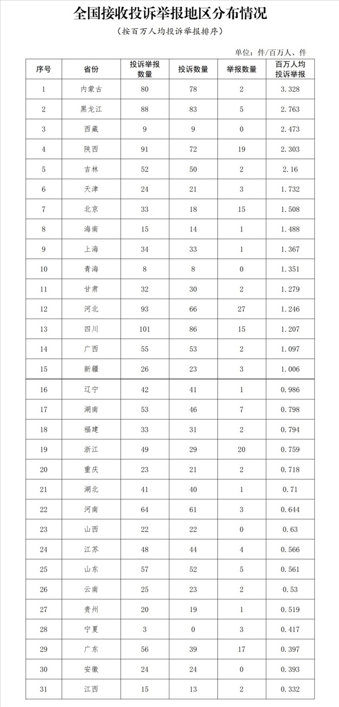 各省(自治區(qū)、直轄市)按照接收投訴舉報(bào)數(shù)量排序,四川、河北、陜西、黑龍江、內(nèi)蒙古排在全國(guó)前5位。其中:按投訴數(shù)量排序,四川、黑龍江、內(nèi)蒙古、陜西、河北排在全國(guó)前5位;按舉報(bào)數(shù)量排序,河北、浙江、陜西、廣東、北京(四川并列)排在全國(guó)前5位;按百萬(wàn)人均投訴舉報(bào)數(shù)量排序,內(nèi)蒙古、黑龍江、西藏、陜西、吉林排在全國(guó)前5位。(全國(guó)接收投訴舉報(bào)地區(qū)分布情況詳見(jiàn)附件1)