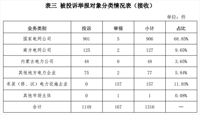 供電企業(yè)1158件、占投訴舉報(bào)總數(shù)的87.99%,其中國(guó)家電網(wǎng)公司906件、占投訴舉報(bào)總數(shù)的68.85%,南方電網(wǎng)公司127件、占投訴舉報(bào)總數(shù)的9.65%,內(nèi)蒙古電力公司48件、占投訴舉報(bào)總數(shù)的3.65%,其他地方電力企業(yè)77件、占投訴舉報(bào)總數(shù)的5.84%;承裝(修、試)電力設(shè)施企業(yè)157件、占投訴舉報(bào)總數(shù)的11.93%;其他市場(chǎng)主體1件、占投訴舉報(bào)總數(shù)的0.08%。