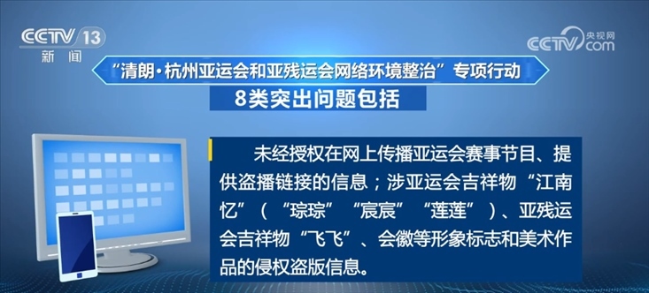 未經(jīng)授權(quán)在網(wǎng)上傳播亞運會賽事節(jié)目、提供盜播鏈接的信息;涉亞運會吉祥物“江南憶”(“琮琮”“宸宸”“蓮蓮”)、亞殘運會吉祥物“飛飛”、會徽等形象標志和美術作品的侵權(quán)盜版信息。