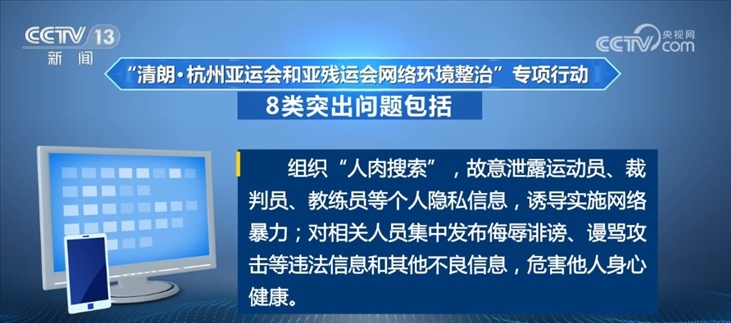 央視網(wǎng)消息:記者昨天(8月28日)從中央網(wǎng)信辦獲悉,為做好杭州亞運會和亞殘運會保障工作,決定自8月28日至10月29日開展“清朗·杭州亞運會和亞殘運會網(wǎng)絡環(huán)境整治”專項行動。專項行動將圍繞賽事舉辦,集中整治散布虛假信息、片面、歪曲傳播突發(fā)事件信息等8類突出問題。