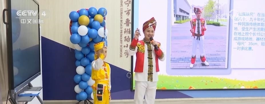 在南寧市魯班路小學,同學們領略了獨具壯族特色的體育活動《迪尺小課堂》。同學們還在開學典禮上身穿自己設計制作的扎染服飾,手拿親手制作的紅陶、皮影等非遺作品,表演了一場非遺秀。