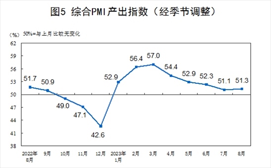 8月份,綜合PMI產(chǎn)出指數(shù)為51.3%,比上月上升0.2個(gè)百分點(diǎn),繼續(xù)保持在擴(kuò)張區(qū)間,表明我國(guó)企業(yè)生產(chǎn)經(jīng)營(yíng)活動(dòng)總體穩(wěn)定擴(kuò)張。