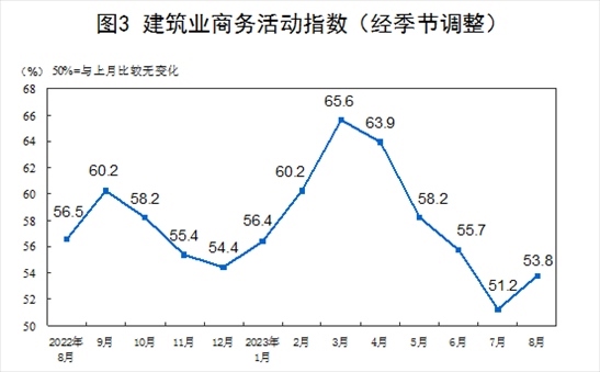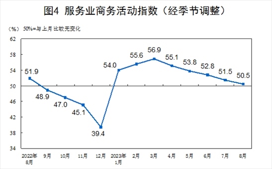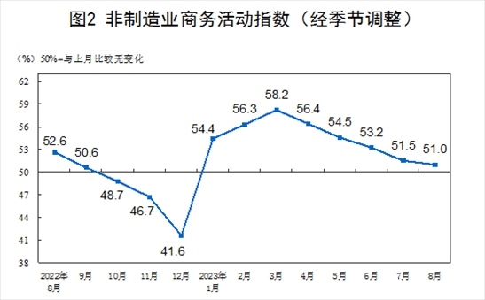 8月份,非制造業(yè)商務(wù)活動(dòng)指數(shù)為51.0%,比上月下降0.5個(gè)百分點(diǎn),仍高于臨界點(diǎn),非制造業(yè)持續(xù)擴(kuò)張。