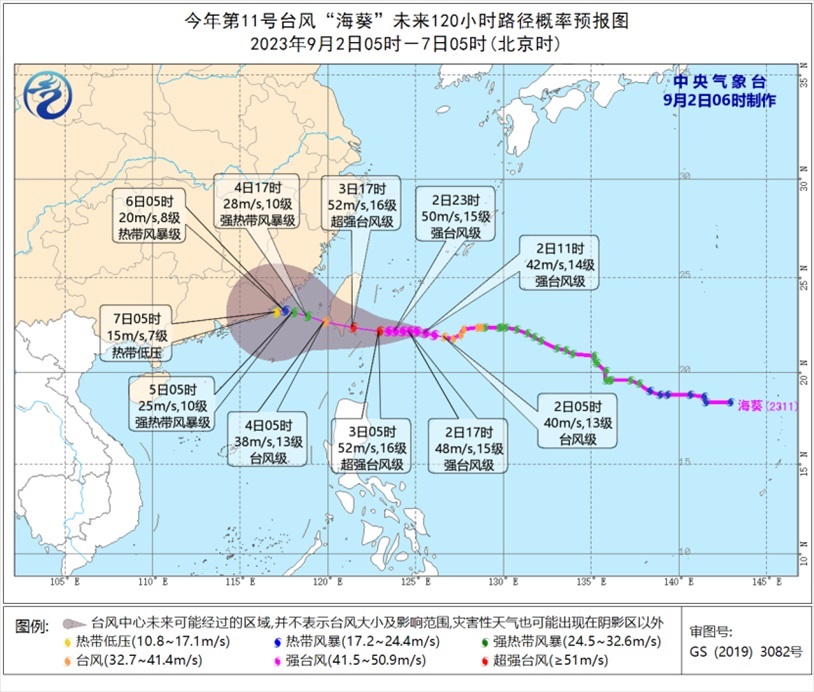 大風(fēng)預(yù)報(bào):9月2日08時(shí)至3日08時(shí),受“蘇拉”影響,南海西北部、北部灣東部、瓊州海峽及廣東沿海、廣西南部沿海、珠江口以及香港和澳門等地將有7-9級(jí)、陣風(fēng)10-11級(jí)的大風(fēng),“蘇拉”中心經(jīng)過的附近海面或地區(qū)風(fēng)力有12-13級(jí)、陣風(fēng)14-15級(jí);受“??庇绊?,臺(tái)灣海峽、浙江南部沿海、福建沿海、廣東東部沿海、臺(tái)灣島沿海將有6-7級(jí),陣風(fēng)8級(jí)大風(fēng),臺(tái)灣以東洋面部分海域風(fēng)力可達(dá)8-10級(jí),陣風(fēng)11-12級(jí),“??敝行慕?jīng)過的附近海面風(fēng)力可達(dá)12-13級(jí),陣風(fēng)14級(jí)。