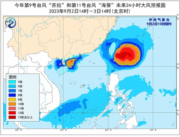 大風(fēng)預(yù)報(bào):9月2日14時(shí)至3日14時(shí),受“蘇拉”影響,南海西北部、北部灣東部、瓊州海峽及廣東中西部沿海、廣西南部沿海、海南北部沿海、珠江口以及香港和澳門等地將有6-8級(jí)、陣風(fēng)9-10級(jí)的大風(fēng),“蘇拉”中心經(jīng)過(guò)的附近海面或地區(qū)風(fēng)力有11-12級(jí)、陣風(fēng)13-14級(jí);受“??庇绊?,臺(tái)灣海峽、巴士海峽、浙江南部沿海、福建沿海、廣東東部沿海、臺(tái)灣島沿海將有6-8級(jí),陣風(fēng)9-10級(jí)大風(fēng),臺(tái)灣以東洋面部分海域風(fēng)力可達(dá)9-12級(jí),陣風(fēng)13-14級(jí),“海葵”中心經(jīng)過(guò)的附近海面風(fēng)力可達(dá)13-16級(jí),陣風(fēng)17級(jí)及以上。