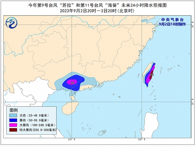 降水預(yù)報(bào): 9月2日20時(shí)至3日20時(shí),受“蘇拉”和“??庇绊?,廣西中南部、廣東西南部、臺(tái)灣島大部有大到暴雨,其中,廣西東南部、臺(tái)灣島東部等地部分地區(qū)有大暴雨,臺(tái)灣島東部局地有特大暴雨(250-300毫米)。