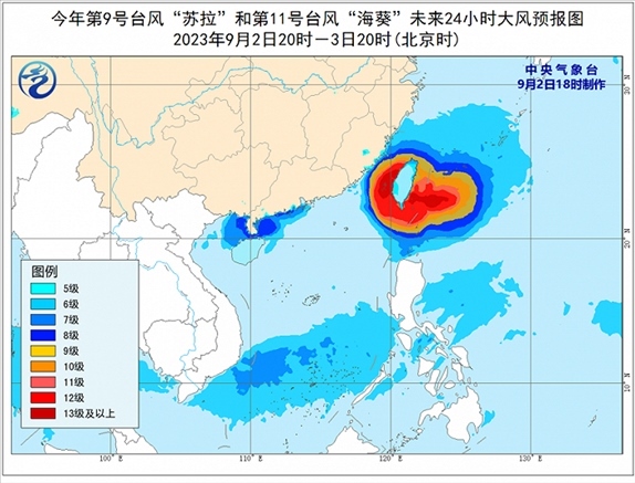 大風(fēng)預(yù)報(bào):9月2日20時(shí)至3日20時(shí),受“蘇拉”影響,廣東中西部沿海、廣西南部沿海、海南島北部沿海、珠江口及澳門等地將有6-7級(jí)大風(fēng),南海西北部、北部灣東部和瓊州海峽將有8級(jí)、陣風(fēng)9-10級(jí)的大風(fēng);受“??庇绊?,巴士海峽南部、臺(tái)灣海峽西部、東海南部及釣魚島附近海域、浙江南部沿海、福建中北部沿海、臺(tái)灣島沿海將有6-8級(jí)、陣風(fēng)9-10級(jí)大風(fēng),巴士海峽北部、臺(tái)灣海峽東部、臺(tái)灣以東洋面及臺(tái)灣島南部沿海的風(fēng)力有9-12級(jí),陣風(fēng)13-14級(jí),“海葵”中心經(jīng)過的附近海面或地區(qū)的風(fēng)力有13-16級(jí),陣風(fēng)17級(jí)。