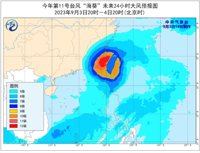 大風(fēng)預(yù)報(bào):9月3日20時(shí)至4日20時(shí),巴士海峽、臺(tái)灣海峽、臺(tái)灣以東洋面、東海南部及釣魚島附近海域、南海東北部以及浙江南部沿海、福建沿海、廣東東部偏東地區(qū)沿海、臺(tái)灣島及沿海將有6-8級、陣風(fēng)9-10級大風(fēng),部分海域或地區(qū)的風(fēng)力有9-12級,陣風(fēng)13-14級,“海葵”中心經(jīng)過的附近海面或地區(qū)的風(fēng)力有13-14級,陣風(fēng)15級。