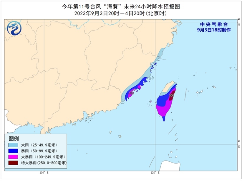降水預(yù)報(bào):9月3日20時(shí)至4日20時(shí),福建東部、浙江東南部沿海、臺(tái)灣島等地有大到暴雨,其中,福建東南部沿海、臺(tái)灣島東部和南部等地部分地區(qū)有大暴雨,臺(tái)灣島東部局地特大暴雨(250~500毫米);上述地區(qū)最大小時(shí)降雨量20~50毫米,局地可超過60毫米,局地還有雷暴大風(fēng)等強(qiáng)對流天氣。