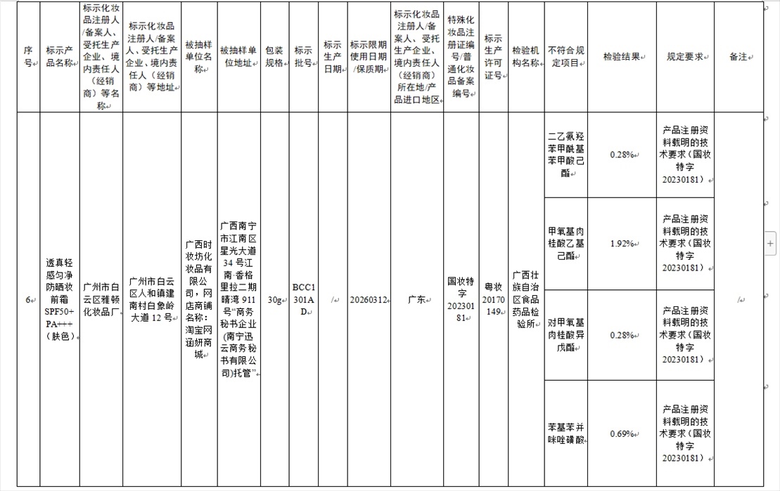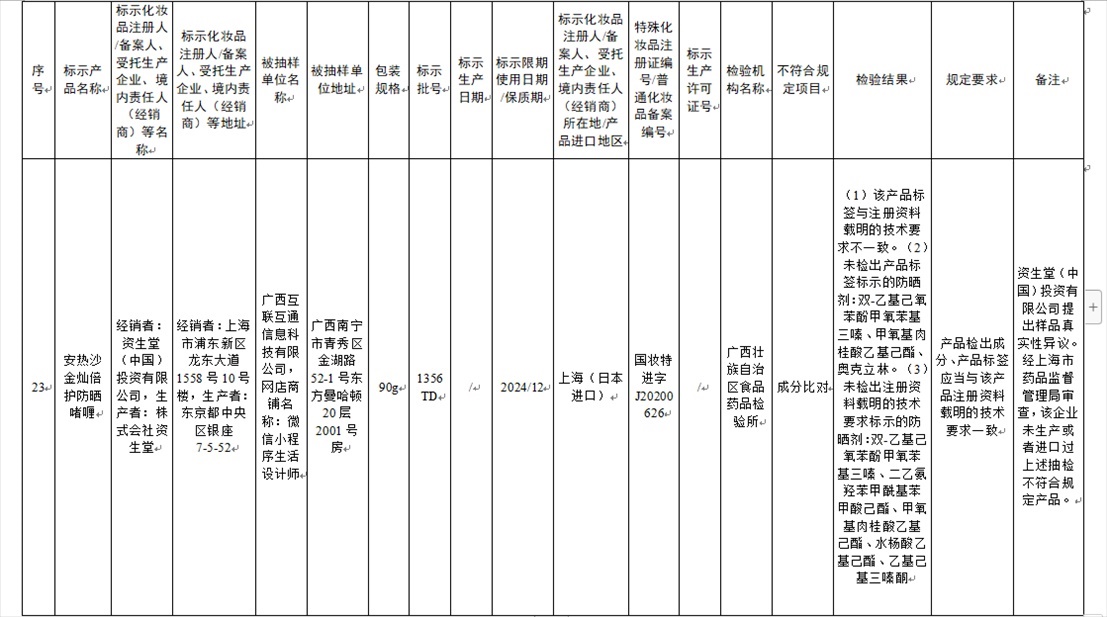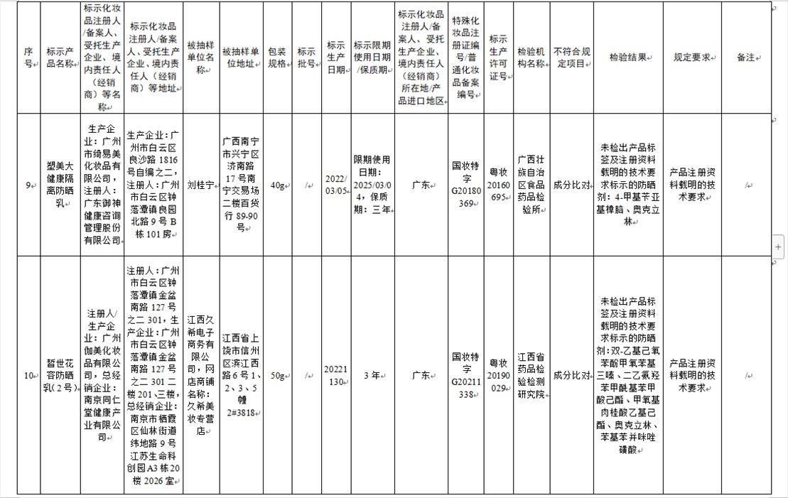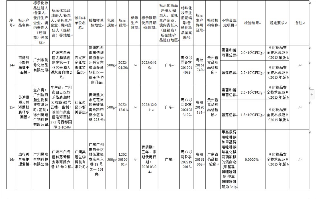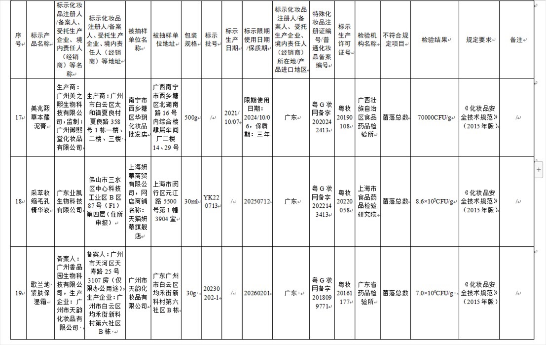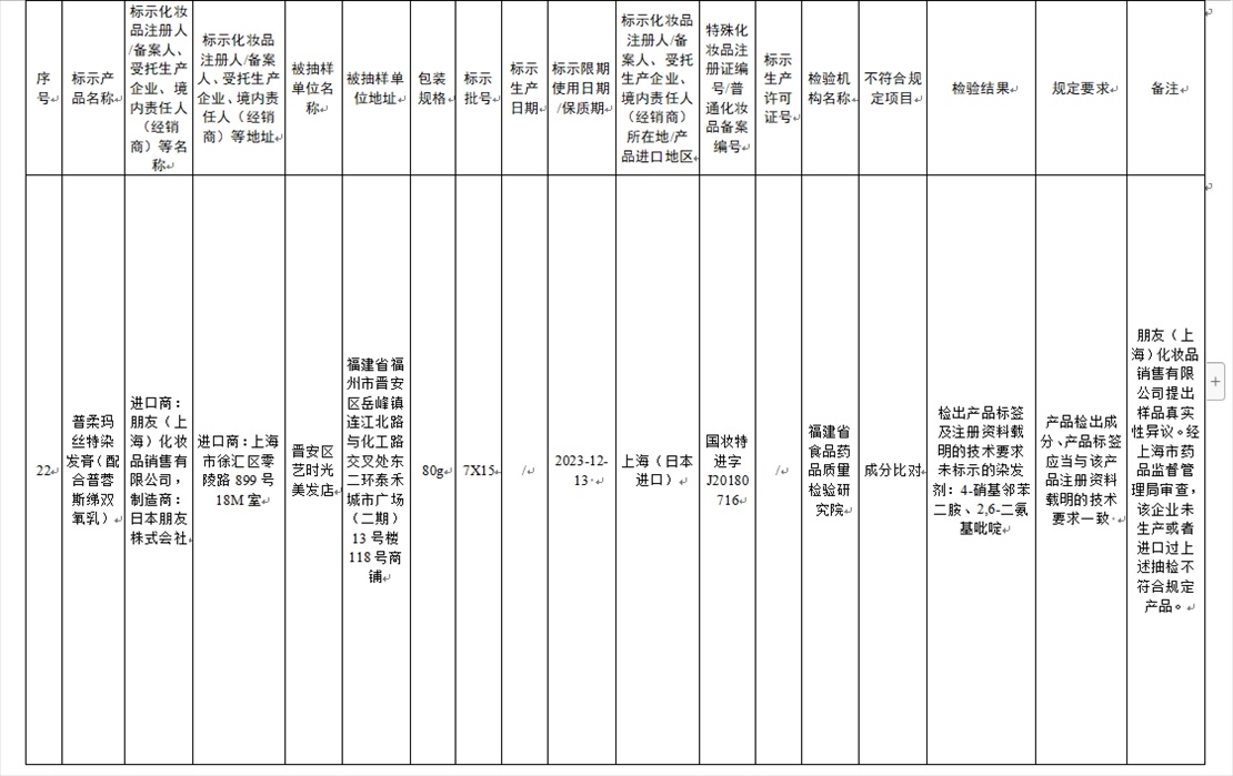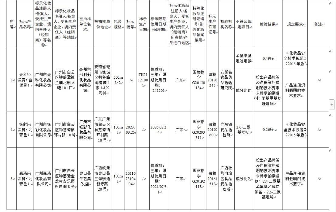 國家藥監(jiān)局網站今天發(fā)布通告稱,在2023年國家化妝品抽樣檢驗工作中,經重慶市食品藥品檢驗檢測研究院等單位檢驗,產品標簽標示為廣州市天科化妝品有限公司生產的天科染發(fā)膏(自然黑)等23批次化妝品不符合規(guī)定(見下圖表格)。