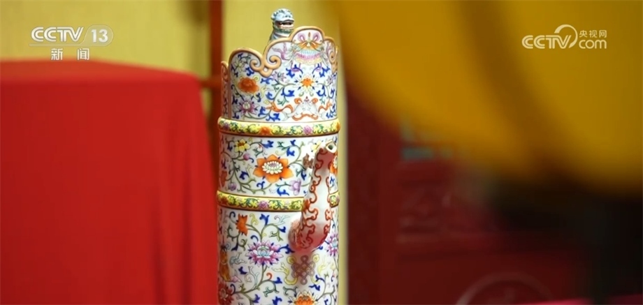 總臺(tái)記者 楊雪:沈陽(yáng)故宮當(dāng)中的很多珍貴院藏文物都見證了多民族文化融合的過程,像我們眼前看到的這款清乾隆款粉彩多穆壺就是其中之一。多穆在藏語(yǔ)當(dāng)中是奶茶桶的意思,直到現(xiàn)在,像銅制、木制、皮質(zhì)的很多多穆壺仍然被蒙、藏等少數(shù)民族沿襲使用著。大家可以看到,這款多穆壺的蓋子上蹲坐著一只非常靈動(dòng)的小獅子,有祈福和護(hù)佑主人的意思。這件多穆壺是國(guó)家一級(jí)文物,距今已經(jīng)有200多年的歷史了。