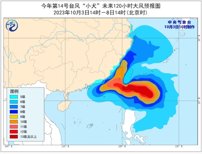 大風(fēng)預(yù)報(bào):3日下午至8日,臺(tái)灣以東洋面、巴士海峽、東海大部、臺(tái)灣海峽、南海東北部以及杭州灣、浙江沿海、福建沿海、廣東東南部沿海以及臺(tái)灣島沿海將有6~8級(jí)大風(fēng),其中,臺(tái)灣以東洋面、巴士海峽、臺(tái)灣海峽、南海東北部部分海面、福建沿海、廣東東南部沿海、臺(tái)灣島東南部和西部沿海的風(fēng)力將有9~12級(jí),“小犬”中心經(jīng)過的附近海面風(fēng)力可達(dá)13~16級(jí),陣風(fēng)17級(jí)。