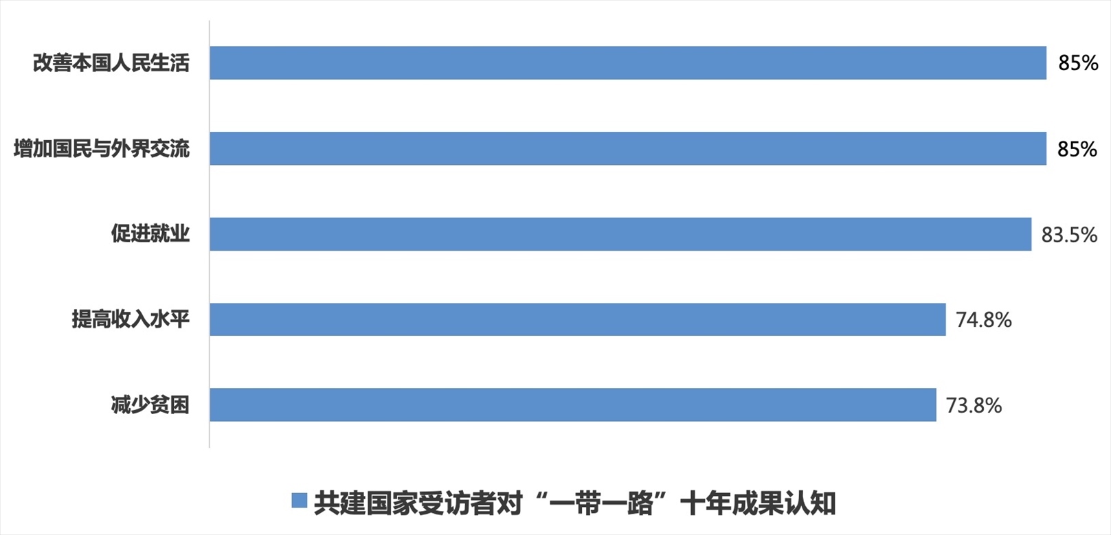 “一帶一路”倡議下一個(gè)個(gè)“惠而實(shí)”的民生工程、民心工程,為各國(guó)人民帶來(lái)實(shí)實(shí)在在的獲得感、幸福感和安全感,85%的共建國(guó)家受訪者認(rèn)為“一帶一路”切實(shí)改善了本國(guó)人民的生活;85%的共建國(guó)家受訪者認(rèn)為通過(guò)“一帶一路”民眾獲得了更多與外界交流互鑒的機(jī)會(huì);分別有83.5%、74.8%和73.8%的共建國(guó)家受訪者認(rèn)可共建“一帶一路”在促進(jìn)就業(yè)、提高居民收入水平和減少貧困方面的作用;86.5%的共建國(guó)家受訪者認(rèn)為“一帶一路”倡議和“以人民為中心”的理念高度契合,惠及全球民眾的愿景正在逐步變?yōu)楝F(xiàn)實(shí)。