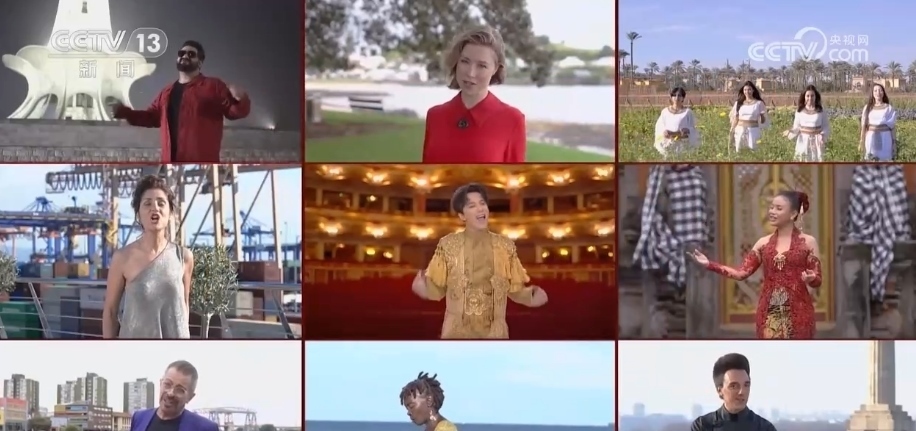 在中國的春節(jié)聯(lián)歡晚會上,來自9個(gè)共建“一帶一路”國家的表演者云端相聚,和著中國藝術(shù)家的伴奏共唱《一帶繁花一路歌》。