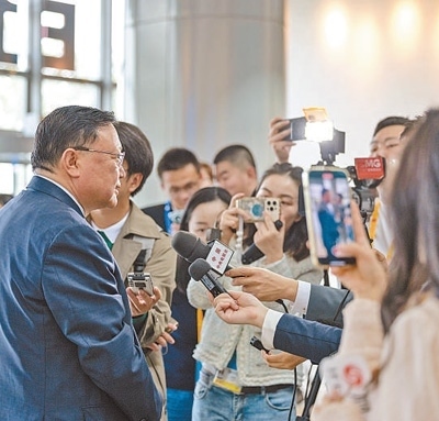 10月17日,參加“一帶一路”企業(yè)家大會(huì)的代表在接受媒體采訪。本報(bào)記者 伊 霄攝