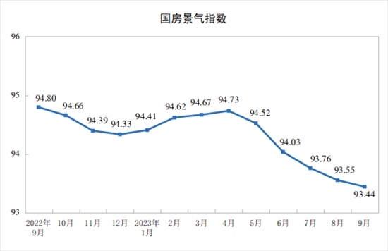 9月份,房地產(chǎn)開發(fā)景氣指數(shù)(簡稱“國房景氣指數(shù)”)為93.44。