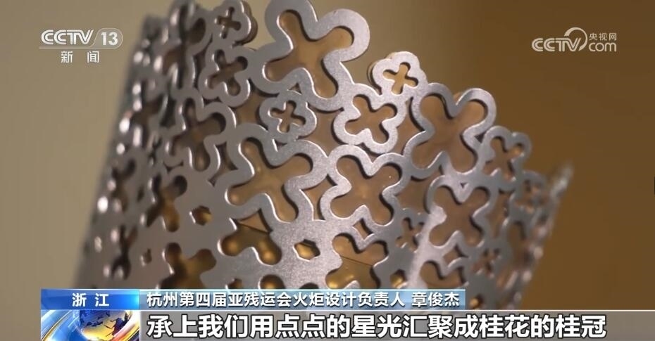 這就是火炬“桂冠”,它的設(shè)計(jì)思想源自良渚玉琮和杭州市花“桂花”。