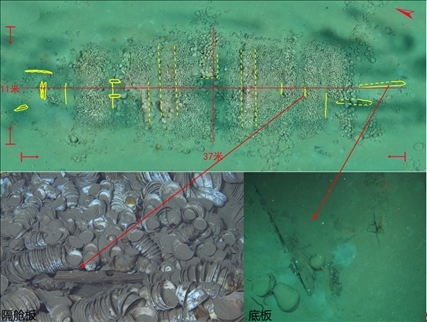 沉船遺址水深約30米,主體區(qū)域殘存有木質(zhì)船體和成摞擺放的船貨堆積,范圍約300平方米??脊虐l(fā)掘發(fā)現(xiàn),沉船船體殘長約16.95米,最寬處保存約4.5米,殘存9道隔艙板和10個船艙,單層板結構,發(fā)現(xiàn)桅座、龍骨板、龍骨補強材以及舭龍骨等船體構件。