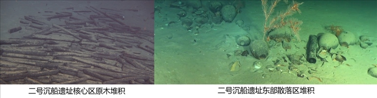 二號沉船遺址位于一號沉船遺址東北約12海里處,由核心區(qū)和散落區(qū)組成,年代為明弘治年間。核心區(qū)為大量碼放整齊的原木堆積,長約21米,最寬約8米,核心區(qū)西北及東部各有一處由少量原木和陶瓷器散落形成的堆積。二號沉船暫未發(fā)現(xiàn)船體,僅在核心區(qū)原木堆積中發(fā)現(xiàn)一根疑似船構件的條木。