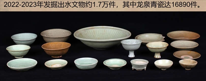 發(fā)掘出水文物標本約1.7萬件,主要為龍泉青瓷和陶罐、鉛錘、印章等船上生活、航海相關文物。其中龍泉青瓷數(shù)量達到1.6萬余件,器形包括碗、盤、碟、盞、洗、缽、香爐和高足杯等,年代為元代晚期,為典型的外銷貿(mào)易瓷。結合溫州朔門古港的考古發(fā)現(xiàn),推測該沉船可能是從溫州港出海前往東南亞的民間貿(mào)易商船。
