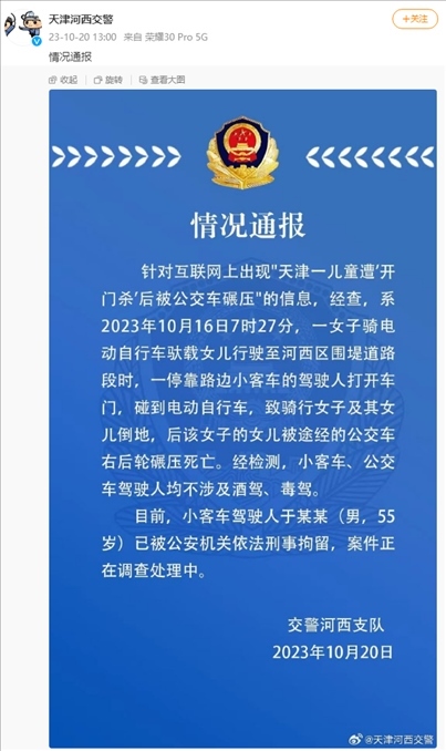 ·天津警方通報(bào)“兒童遭開(kāi)門(mén)殺后被公交碾壓死亡”:小客車(chē)駕駛?cè)艘驯恍淌戮辛?,案件正在調(diào)查處理中。