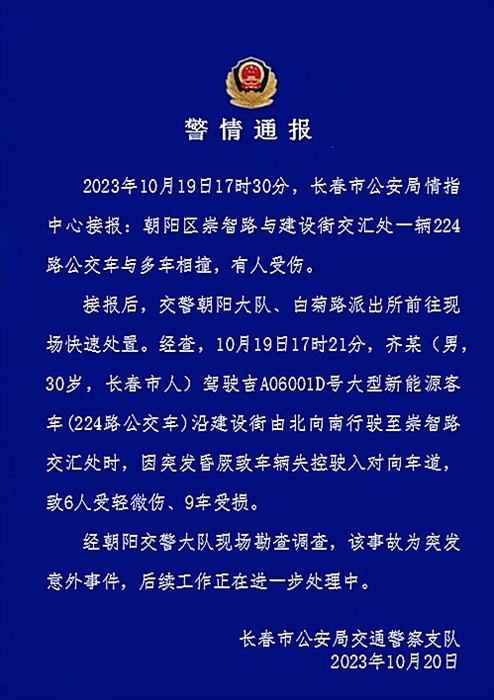 ·長(zhǎng)春交警通報(bào)公交車(chē)與多車(chē)相撞:30歲司機(jī)突發(fā)昏厥致車(chē)輛失控,6人輕微傷。